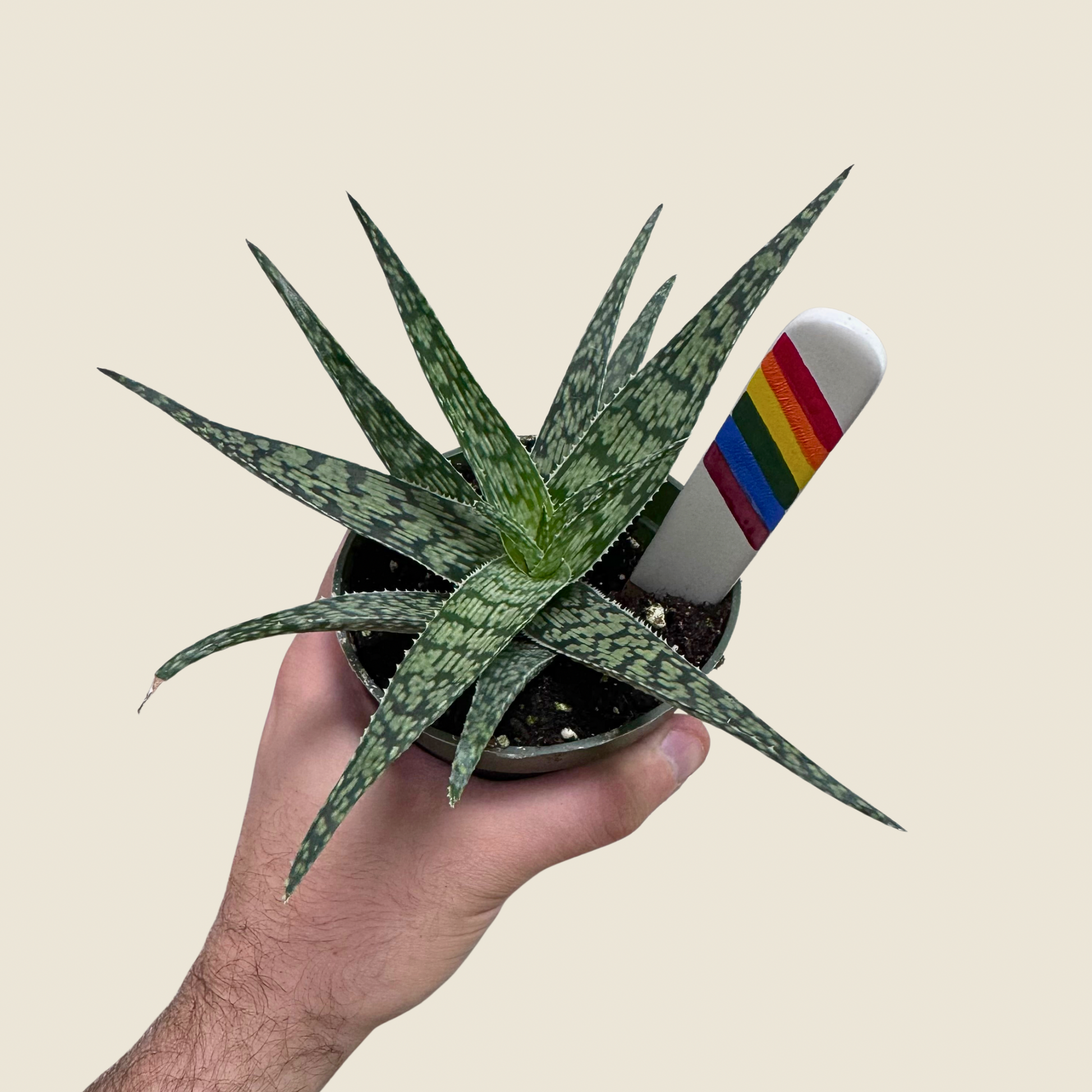 The Aloe ‘White Fox’ is a compact succulent with striking green leaves speckled and banded in bright white markings, giving it a bold, patterned look. Its upright rosette form and easy-care nature make it a perfect choice for windowsills, desks, or small arrangements.