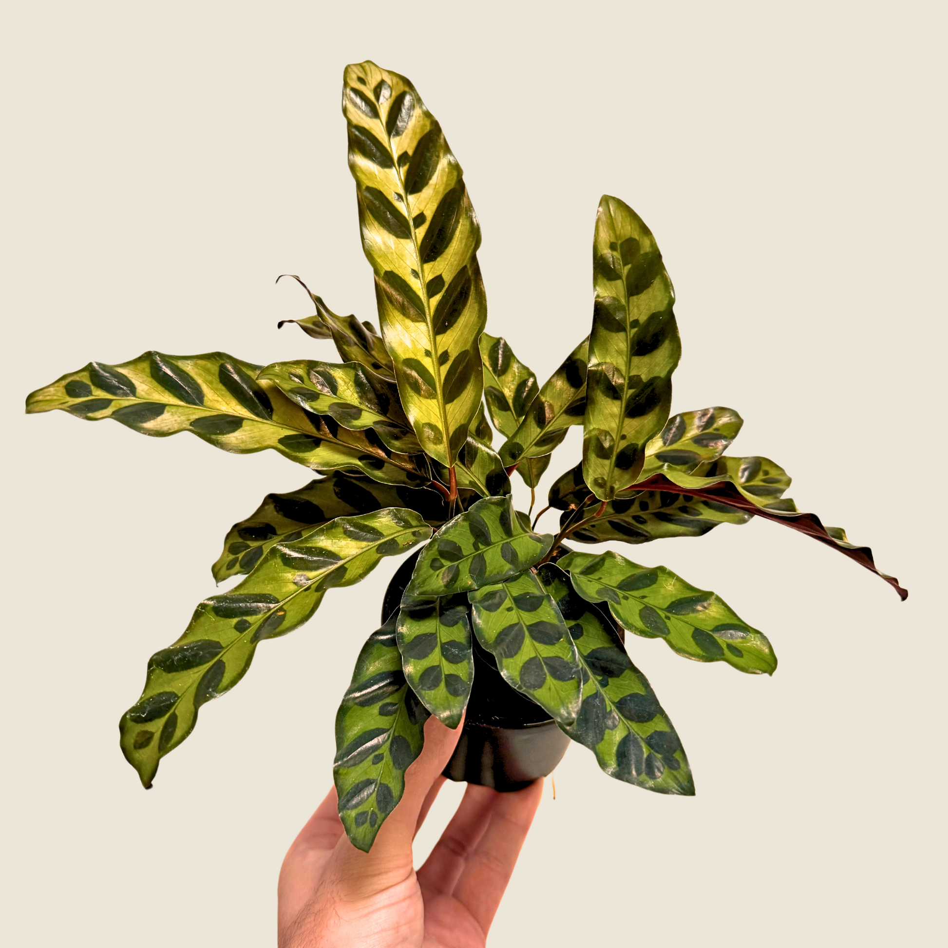 The Calathea Rattlesnake is a tropical showstopper with long, lance-shaped leaves patterned in dark green spots and rich purple undersides. Easy-care, pet-safe, and perfect for adding bold texture and movement to your collection.