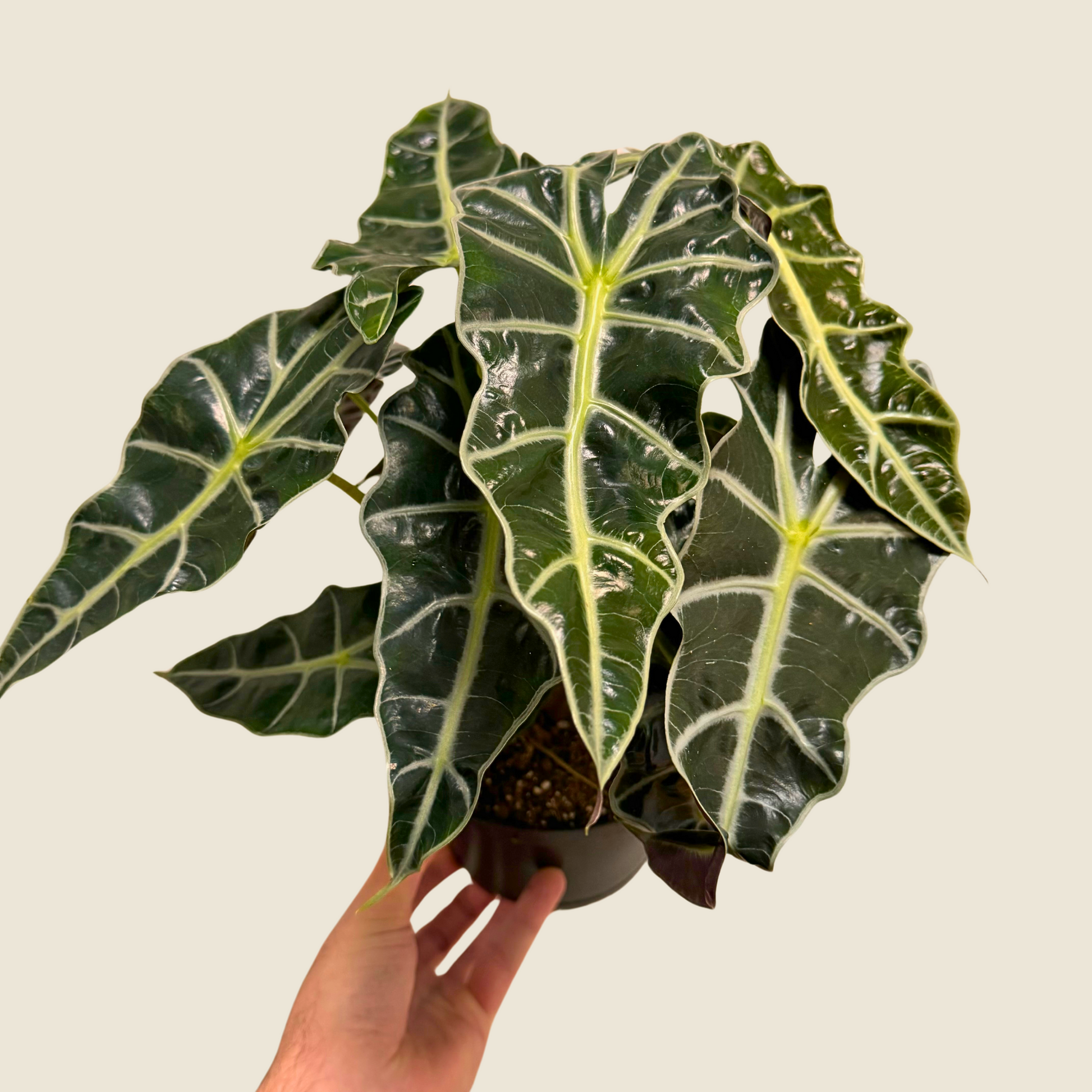 Bold and dramatic, Alocasia ‘Polly’—also known as African Mask Plant or Alocasia amazonica ‘Polly’—is a compact hybrid celebrated for its striking, arrow-shaped leaves. Each leaf displays a deep green, almost black surface, highlighted by contrasting silvery-white veins and scalloped edges, creating an unmistakable architectural look.