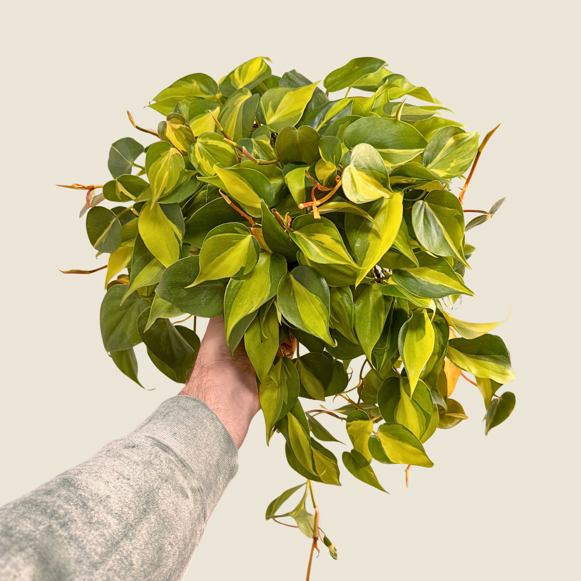 The Philodendron Brasil is a beloved trailing variety with heart-shaped leaves streaked in vibrant lime green and golden yellow variegation. Easy to grow and fast to trail, it adds a lively splash of color to shelves, hanging baskets, or plant walls.